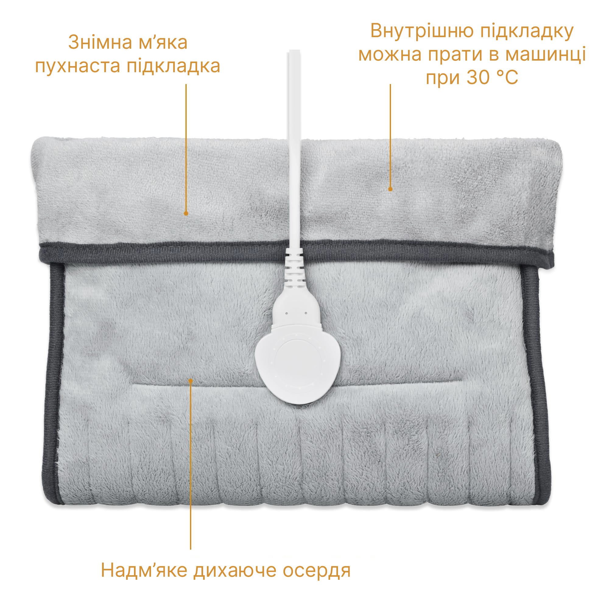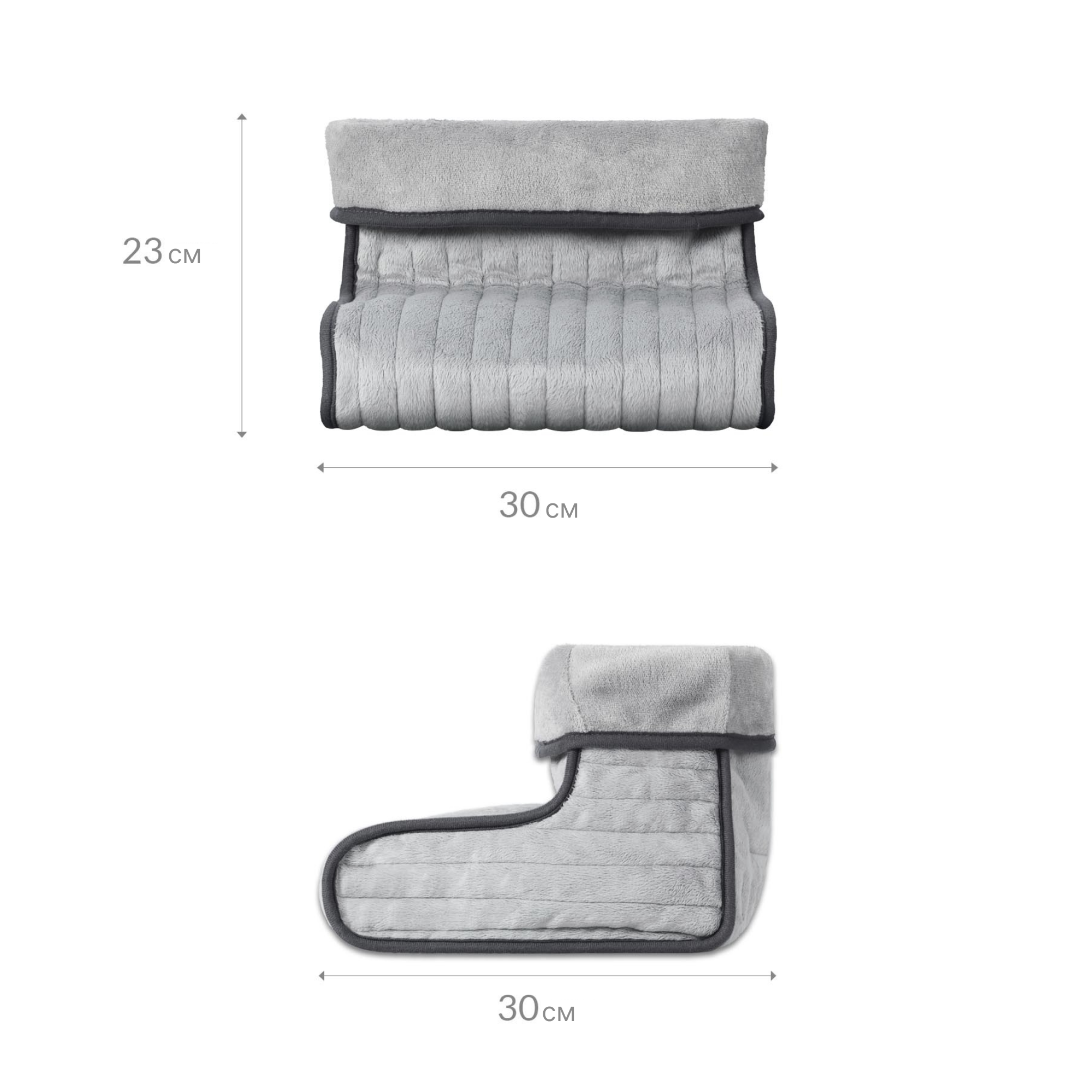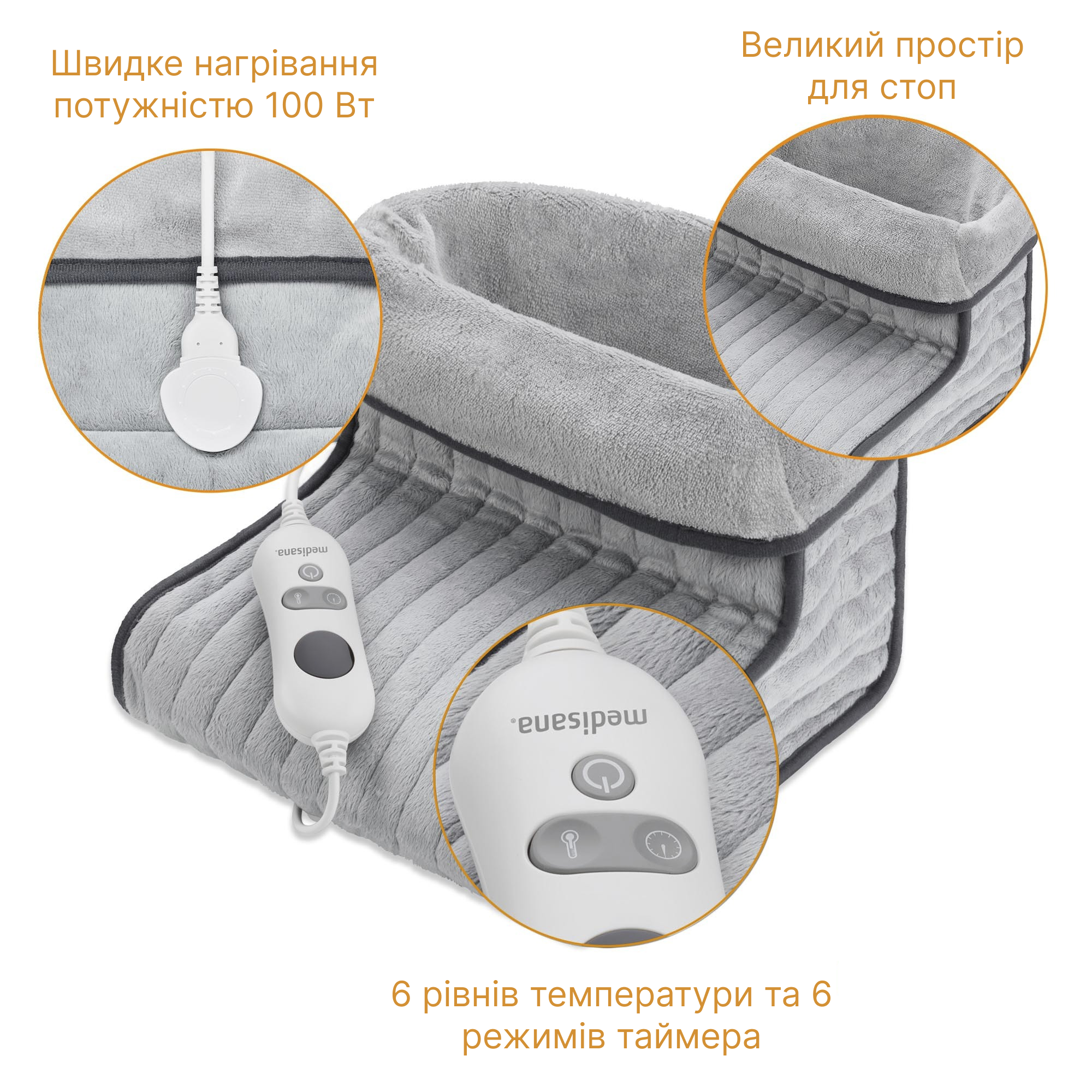 Грілка для ніг працює з 3 вільно регульованими рівнями температури. М'який матеріал, що дихає, не створює відчуття дискомфорту в ногах. Матеріал грілки відповідає стандарту Oeko-Tex Standard 100. Нагрівається протягом 3-4 хвилин завдяки високій потужності (100 Вт), а за допомогою трьох температурних режимів ви легко налаштуєте необхідну вам інтенсивність тепла. Грелка грітиме ваші ніжки 90 хвилин, після чого автоматично відключиться, запобігаючи перегріву. Спроектована з розрахунком, що їй зможе скористатися вся родина з будь-яким розміром ноги. Достатньо простора частина для стоп забезпечить комфортне використання і для маленьких ніжок 35 розмірів та великих стоп 46 розмірів.