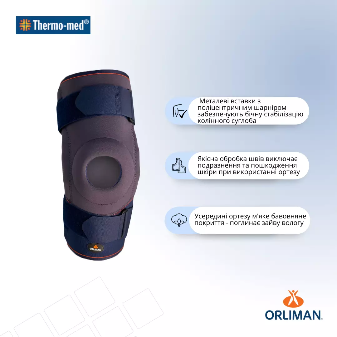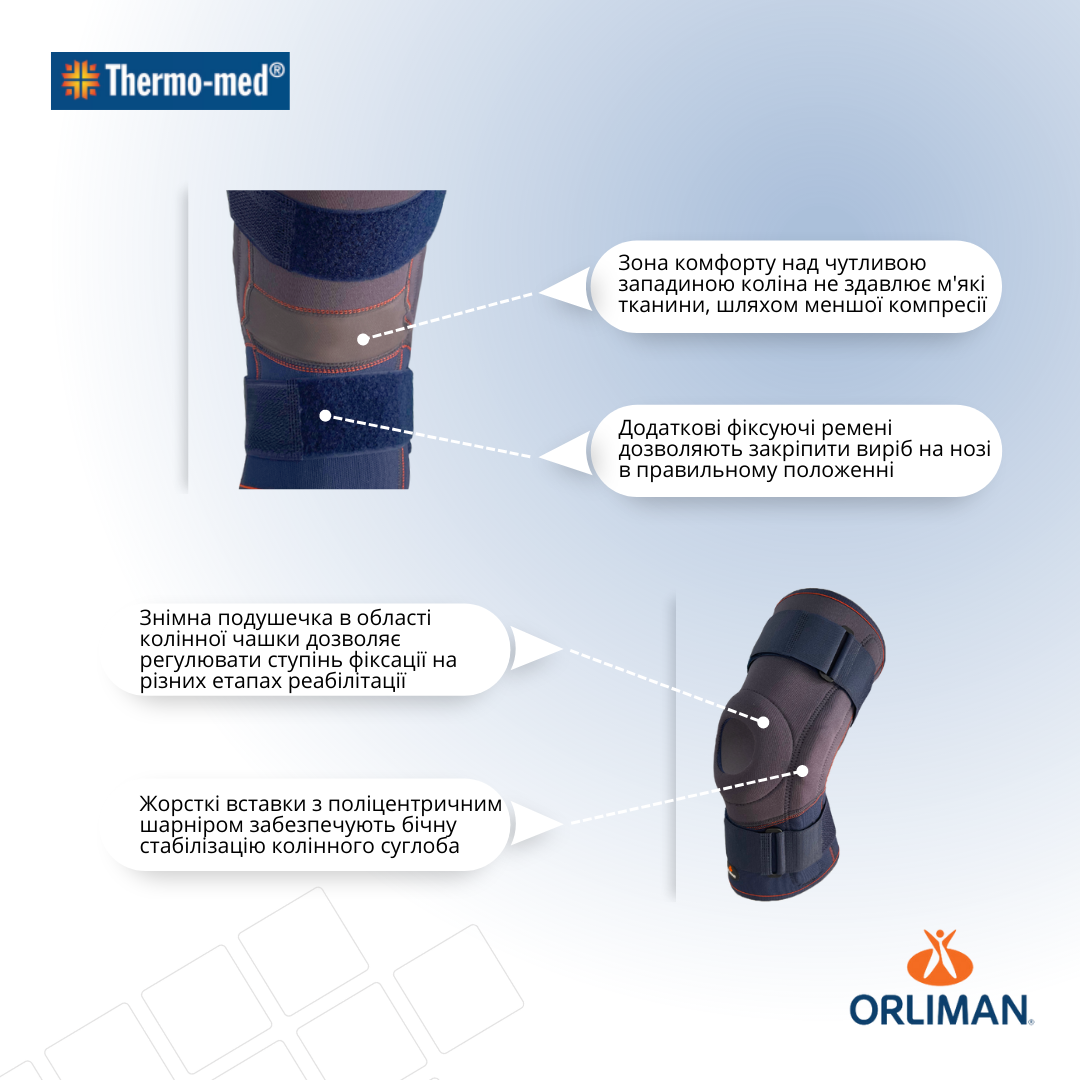 Наколінник виконаний з неопрену, матеріалу який має зігрівальну дію. Усередині ортезу м'яке бавовняне покриття - поглинає зайву вологу. Металеві вставки з поліцентричним шарніром забезпечують бічну стабілізацію колінного суглоба. Верхній та нижній ремені надійно фіксують ортез на нозі. Якісна обробка швів виключає подразнення та пошкодження шкіри при використанні ортезу. Отвір для підтримки колінної чашечки має знімну подушечку всередині, за допомогою якої, на різних етапах реабілітації, можна регулювати рівень фіксації.