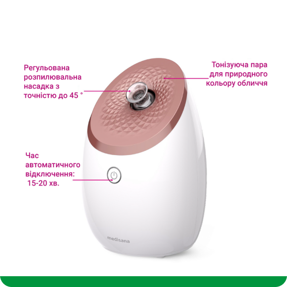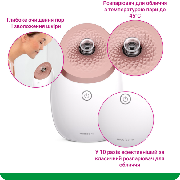 Мікрочастинки пару глибоко проникають у шкіру, інтенсивно зволожуючи її зсередини. Це допомагає зменшити сухість, лущення та робить шкіру більш пружною. Завдяки цьому обличчя виглядає доглянутим і сяючим.