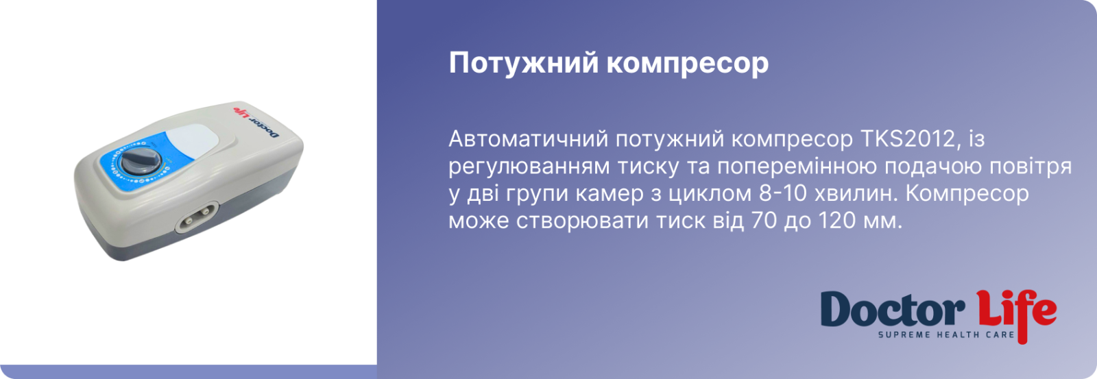 Комірчастий протипролежневий матрац з компресором Doctor Life В01-TKS2012 призначений для людей, які тривалий час знаходяться у лежачому положенні. Рекомендований для профілактики і лікування пролежнів 1–2 ступенів.