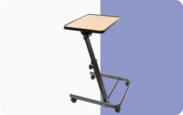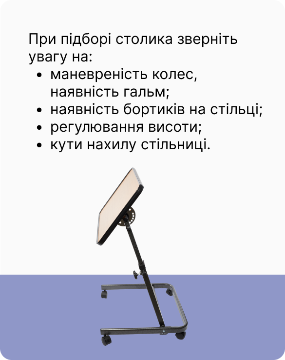 Приліжковий стіл призначений для догляду за пацієнтами, що перебувають у ліжку, пацієнтами з ураженням опорно-рухового апарату. Особливість столику в тому, що він має спеціальну конструкцію для зручного використання і в кріслі колісному.