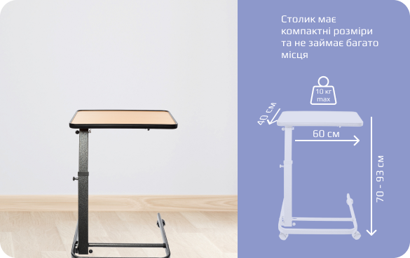 Завдяки спеціальній конструкції стіл може використовуватися, як для ліжка так і для крісла колісного.