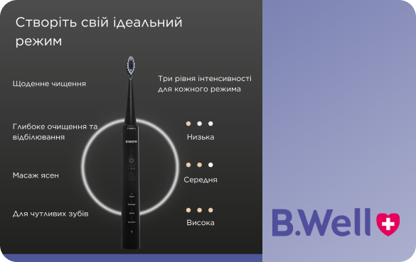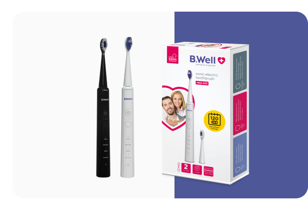 Електрична зубна щітка B.Well підійде кожному користувачу, завдяки індивідуальному налаштуванню та вибору режима. Звукова зубна щітка MED-870 безпечна для пломб, мостів, імплантів, коронок і брекетів.