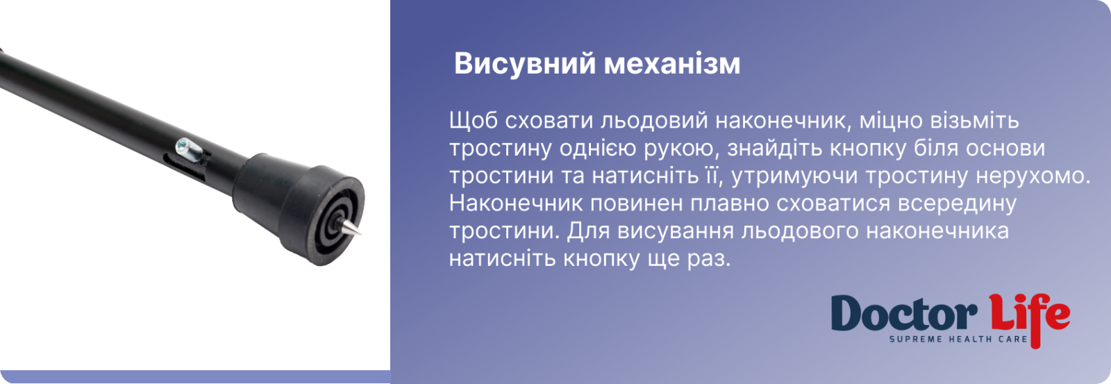Тростина з пристроєм проти ковзання - це медичний виріб, який допомагає полегшити самостійне пересування осіб з інвалідністю, людей похилого віку та тих, хто проходить реабілітацію після травм або операцій. Використання цієї тростини під час ходьби покращує рівновагу завдяки додатковій точці опори. Зручна система висування наконечника дозволяє використовувати виріб у будь-яку пору року. Спеціальний затворний механізм дає змогу висунути загострений наконечник для безпечного пересування по слизькій поверхні або сховати його, коли він не потрібен. Щоб сховати льодовий наконечник, міцно візьміть тростину однією рукою, знайдіть кнопку біля основи тростини та натисніть її, утримуючи тростину нерухомо. Наконечник повинен плавно сховатися всередину тростини. Для висування льодового наконечника натисніть кнопку ще раз.