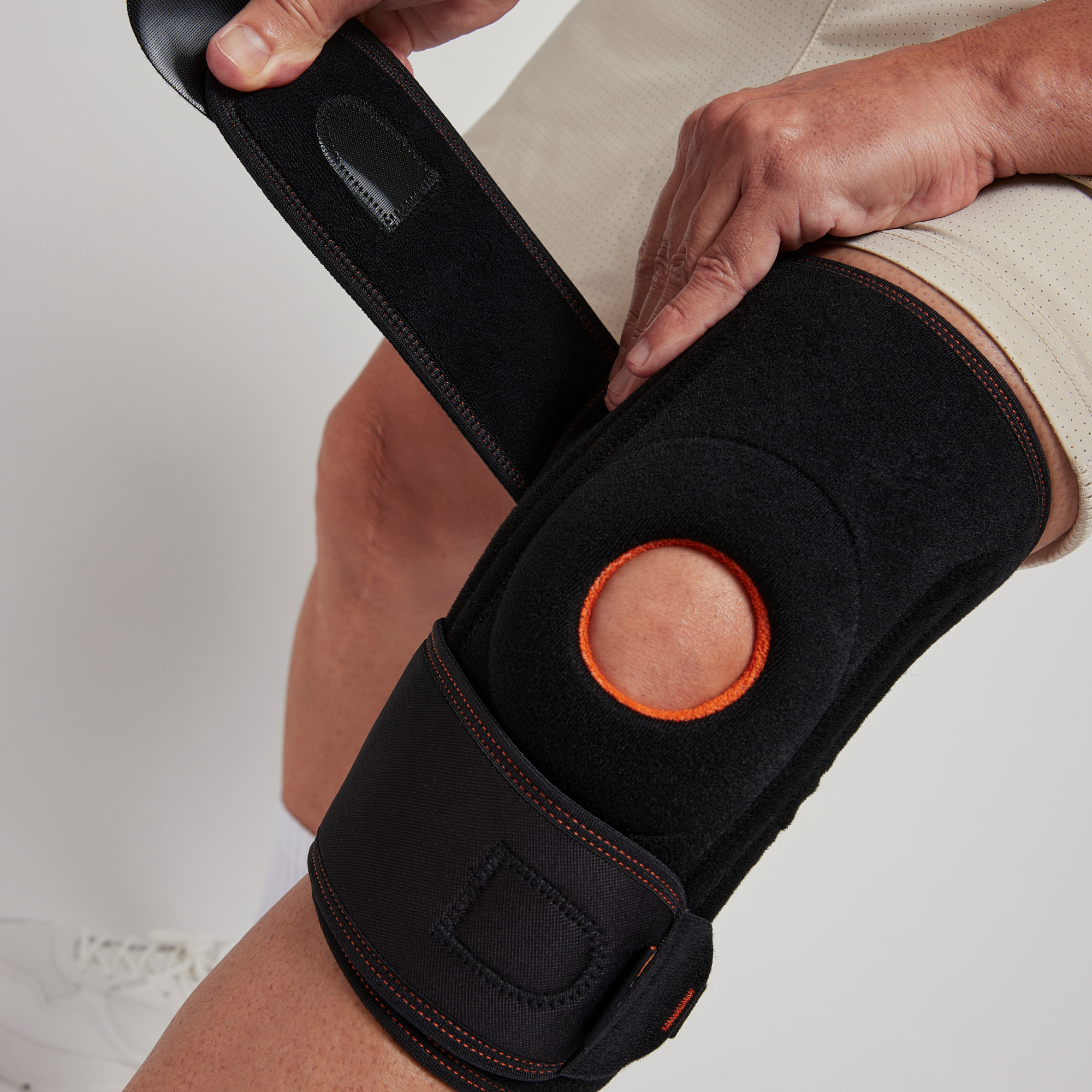 Модель має відкриту конструкцію, що значно полегшує надягання пацієнтам із набряками, післяопераційними пов’язками або з обмеженням рухливості. Пружинні ребра жорсткості з обох боків забезпечують стабілізацію суглоба та знижують навантаження на бокові зв'язки коліна. Додаткові ремені з фіксацією запобігають зміщенню ортеза, а внутрішня силіконова доріжка перешкоджає його зісковзуванню.