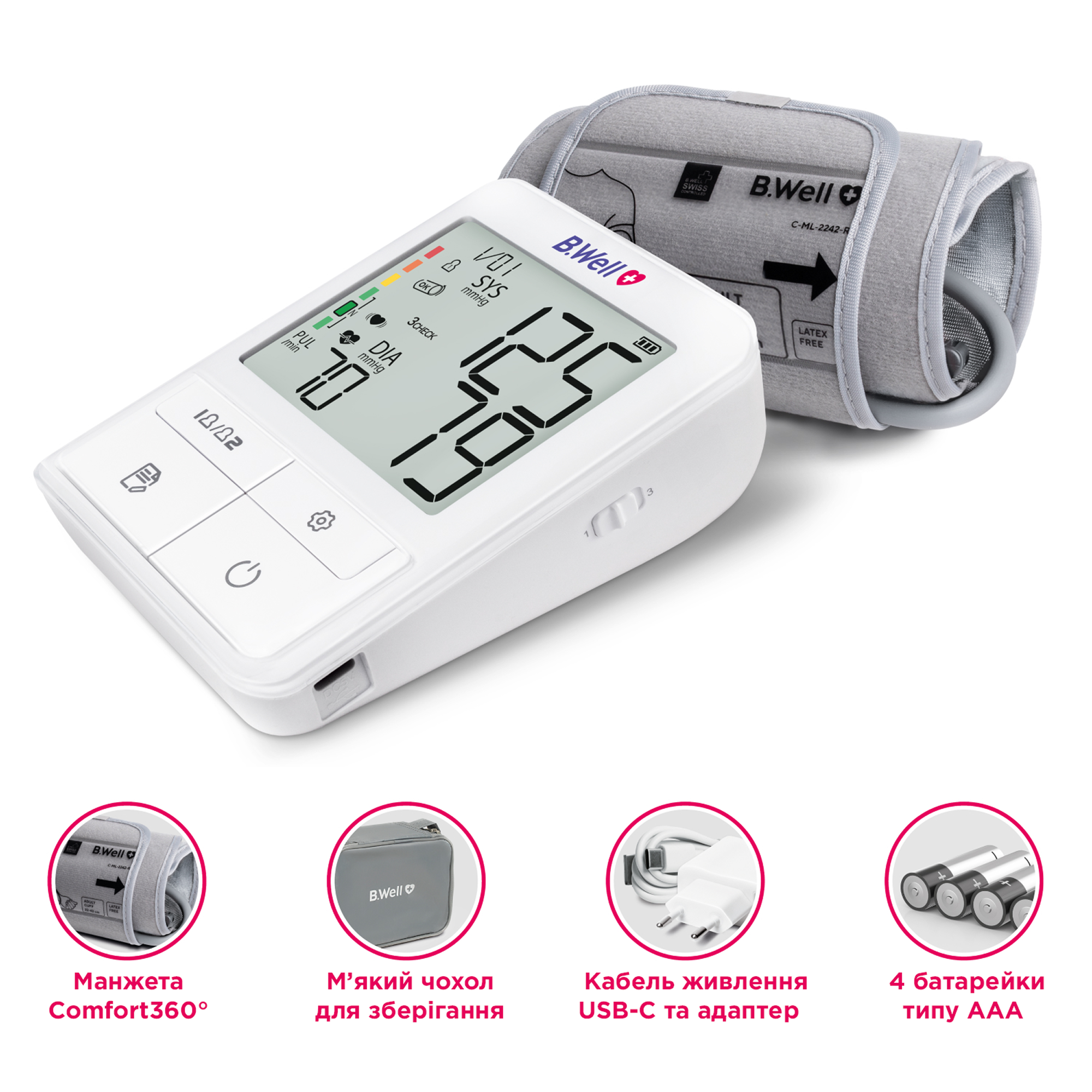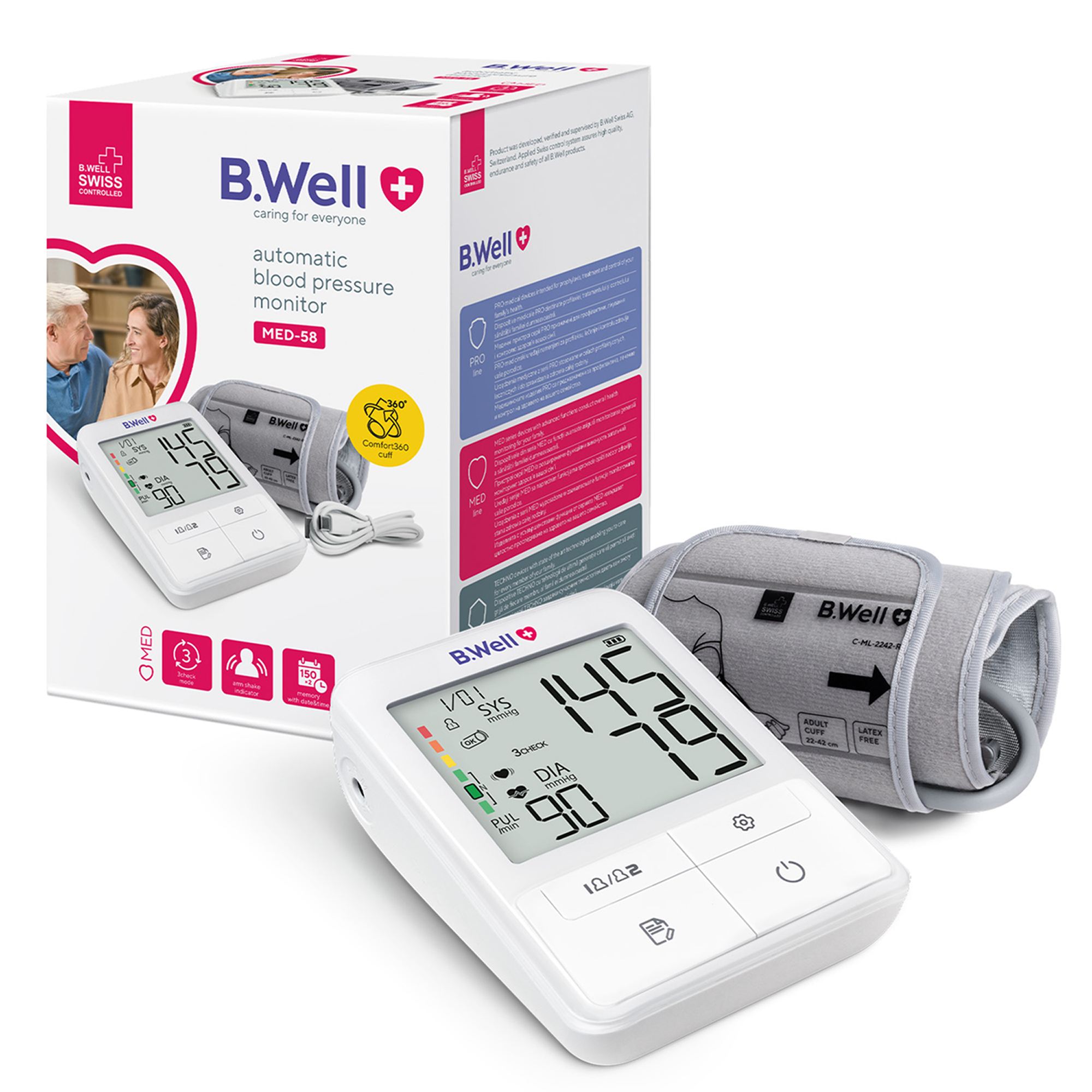 B.Well MED-58 – сучасний автоматичний тонометр із манжетою Comfort360 та інтелектуальним режимом 3CHECK для максимально точного вимірювання тиску вдома. Спрощений інтерфейс і унікальна манжета роблять прилад зручним навіть для літніх людей.