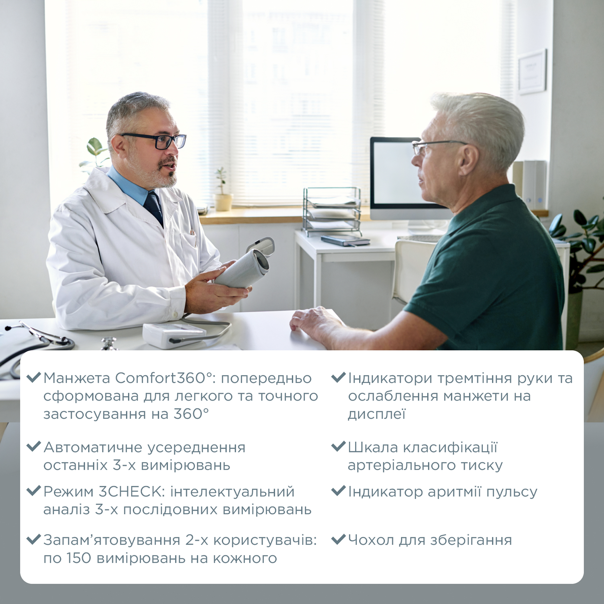 - Манжета Comfort360 – попередньо сформована, рівномірно охоплює руку на 360°