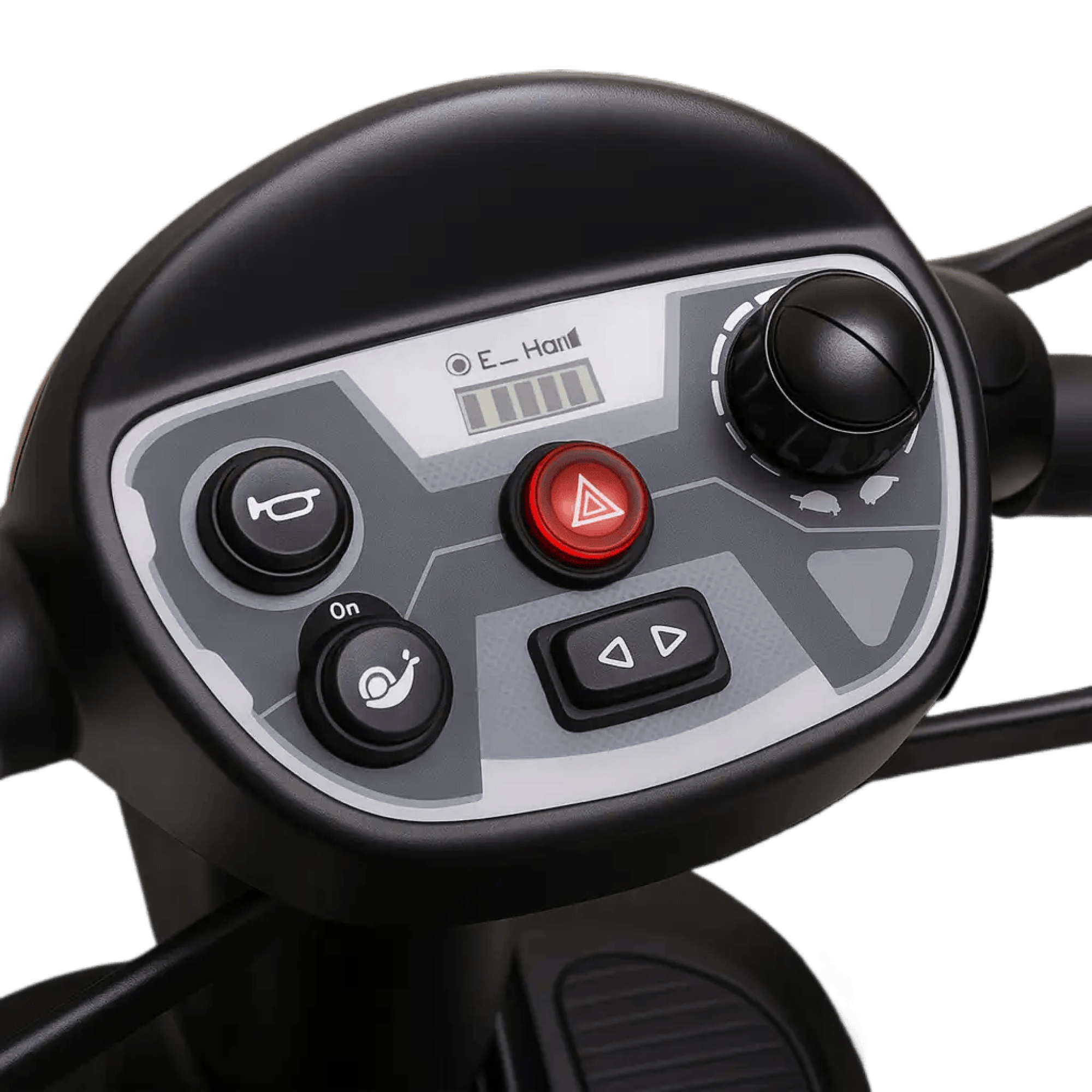 Має регулятор швидкості, кнопку звукового сигналу, індикатор заряду акумулятора та кнопки керування системою освітлення.