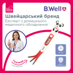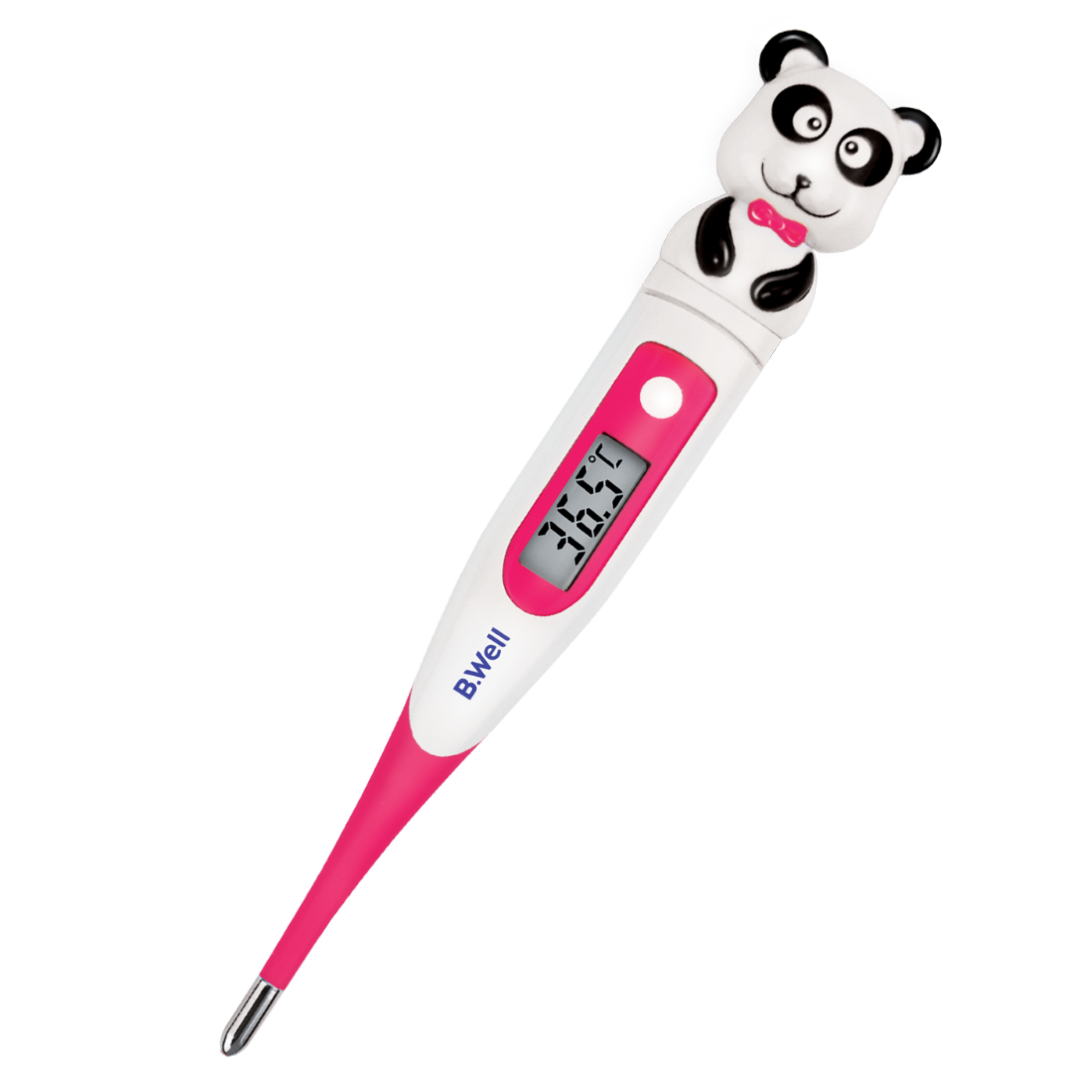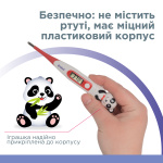 Цифровий термометр PRO-06 flex оснащений гнучким наконечником, який забезпечує м’який і безпечний контакт зі шкірою. Вимірювання температури триває близько 10 секунд, тому процедура не викликає дискомфорту у дитини. Завдяки яскравому дизайну у вигляді панди, термометр перетворює вимірювання температури на гру та допомагає зменшити страх у дітей. Прилад запам’ятовує останній результат вимірювання та автоматично вимикається для економії заряду батареї.