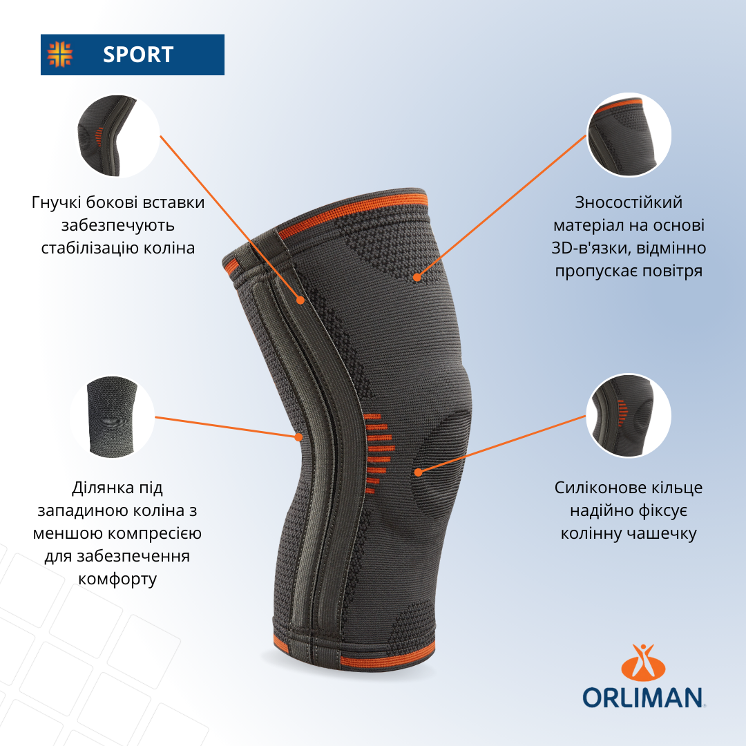 An elastic ring-shaped insert made of technogel securely fixes the patella, flexible side inserts provide lateral stabilization of the knee, while not restricting movement