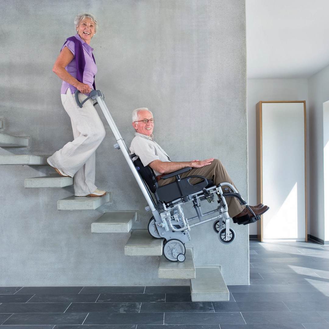 You are looking for a powerful stair climber that matches perfectly with your stroller? The Scalamobil S35 is a great stair climber that fits perfectly with a lot of strollers. The Alber Scalamobil S35 is equipped with the innovative ErgoBalance, whose handles have been designed by experts to ensure safe and easy operation. work. Embedded IQ sensors provide added comfort and safety. With the Scalamobil S35, stairs are not an obstacle. The Scalamobil S35 is built with a patented lifting mechanism. The patented electric lifting mechanism allows the Scalamobil to overcome even narrow and spiral stairs made of any material. The effort for maintenance personnel is negligible. Four automatic safety brakes on the wheels safely move the Scalamobil up any ladder. Patented IQ sensors support the user and ensure a very safe and above all comfortable ascent or descent. With soft, abrasion-resistant wheels, the Scalamobil prevents damage to stairs. Alber Scalamobil S35 is also easy and safe to operate. The ergonomic shape of the new ErgoBalance handles on the Scalamobil has been designed by experts to ensure easy and safe handling. The soft padding on the back of the handle, combined with the convenient control switch, guarantees longer, trouble-free use. All major functions are instantly visible on the clear display. The handles can be adjusted in height and width, perfectly adapting to the accompanying person.