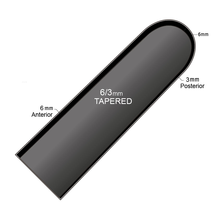 The Alps Anterior Posterior Tapered Liner tapers gradually from a thicker anterior portion to a thinner posterior portion, allowing freedom of movement for users with a lower leg amputation. The 6mm thick anterior portion provides a high level of protection for the bony areas. By combining High Density Gel with limited vertical tissue elasticity, this liner minimizes soft tissue movement and reduces the vertical oscillation effect, providing a high level of prosthetic control.