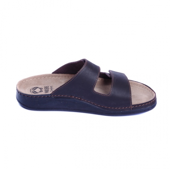 The upper is made from genuine leather. The main feature is the anatomical sole with a deepening of the foot bed. The orthopedic insole supports the arches of the foot and has high cushioning properties. The glue-and-stitch method makes the shoes more durable, and the polyurethane sole has an anti-slip effect. Straps can be used to adjust the width of the fit.