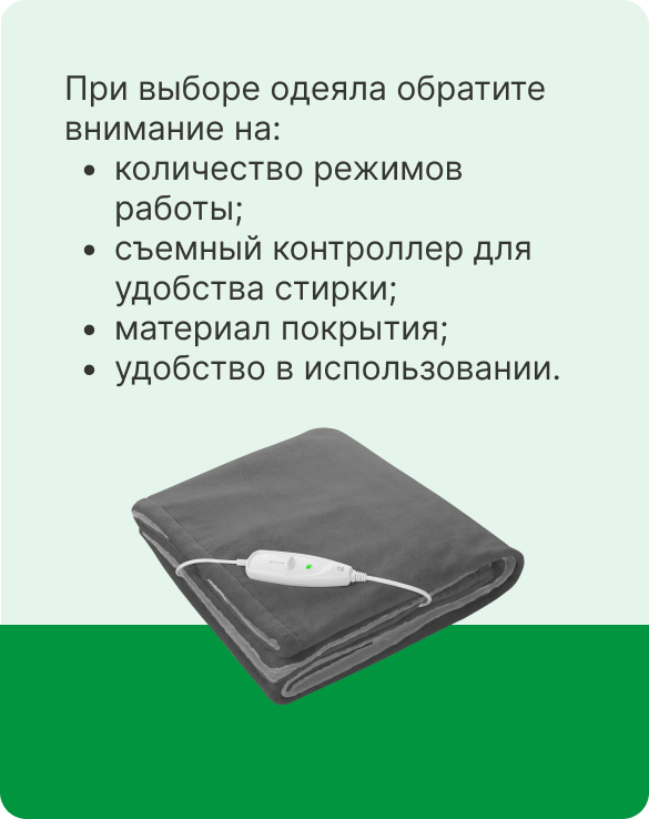 Электроодеяло обеспечивает комфортный уровень тепла для каждого. Используйте его для удобного сна в любое время года. Благодаря своей универсальности и портативности одеяло удобно брать с собой в путешествие.