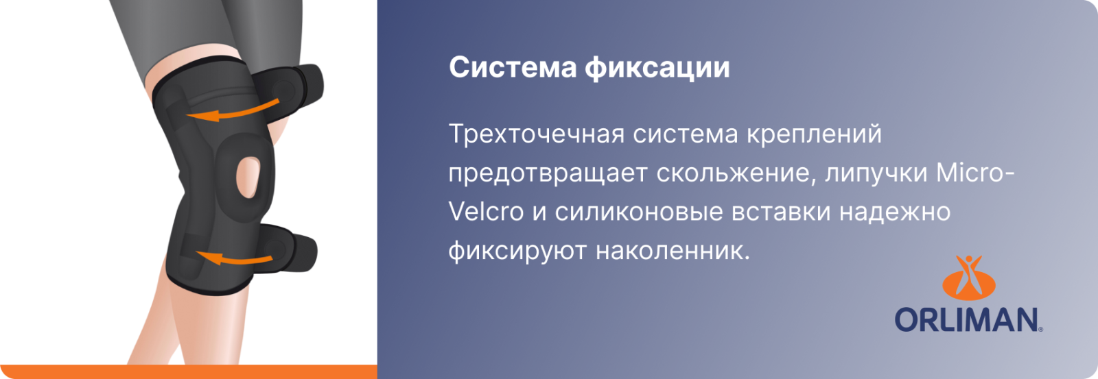 Изделие оснащено боковыми металлическими вставками с полицентрическим шарниром, для улучшения латеральной стабилизации коленного сустава, что обеспечивает анатомически правильное движение при гибке/разгибании.