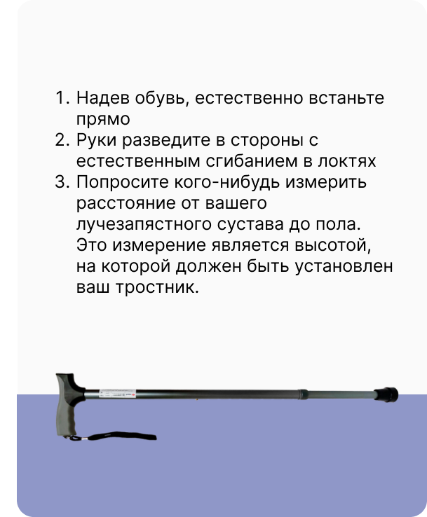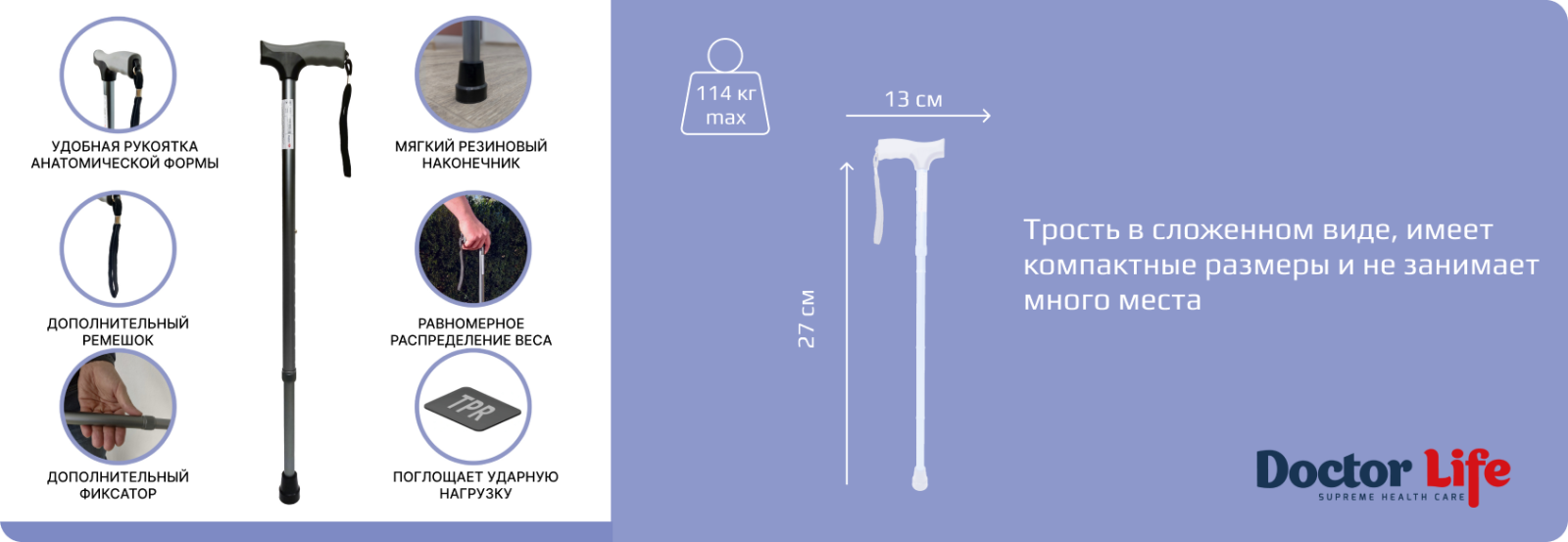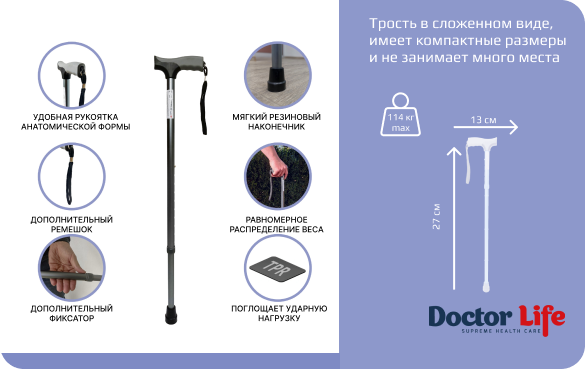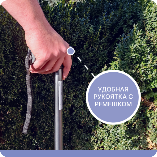 Для удобства транспортировки и хранения имеет дополнительную петельку на рукоятке. При движении помогает максимально снять нагрузку с нижних конечностей, держать тело в удобном вертикальном положении и сохранять равновесие.