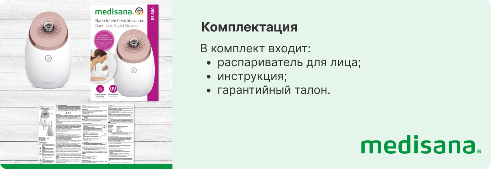 DS 600 - это распаритель для лица с нагреванием пара до 45°C для глубокого очищения пор и увлажнения кожи. Пара образуется с помощью эффективной УФ-технологии, благодаря которой первая пара видна уже через минуту после включения. Рекомендуется использовать с дистиллированной водой.Знаете ли вы? Нано-ионный распаритель для лица в десять раз эффективнее классического благодаря микрочастицам пара, которые способны проникать глубже в кожу.