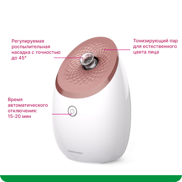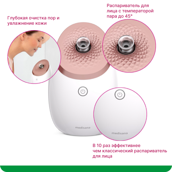 Микрочастицы пара глубоко проникают в кожу, интенсивно увлажняя ее изнутри. Это помогает уменьшить сухость, шелушение и делает кожу более упругой. Благодаря этому лицо выглядит ухоженным и сияющим.