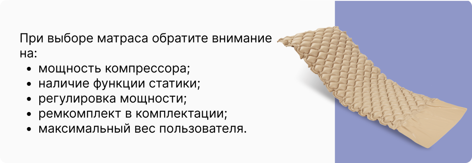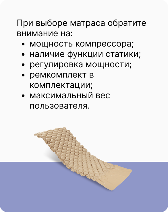 Матрас работает по принципу изменения давления воздуха в двух группах камер. Это обеспечивает постоянное изменение «точек опоры» и осуществляет постоянный эффект массажа, что улучшает трофику кожи и предупреждает возникновение пролежней у пользователей, а также облегчает уход за тяжелобольными.