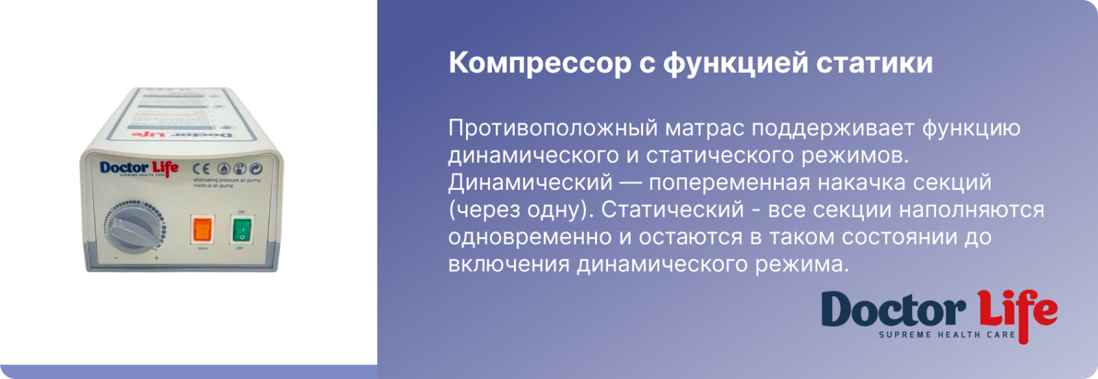 Ячеистый противопролежневый матрас с компрессором Doctor Life B01-P01S предназначен для людей, длительно находящихся в лежачем положении. Рекомендован для профилактики и лечения пролежней 1-2 степеней.