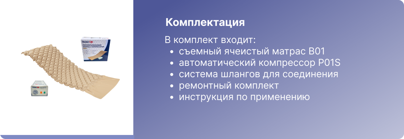 Противопролежневый ячеистый матрас Doctor Life B01-P01S – для профилактики и лечения пролежней, как в стационаре, так и в домашних условиях, у пациентов с поражениями опорно-двигательного аппарата и центральной нервной системы, тяжелыми соматическими заболеваниями, сопровождающимися длительными вынужденными неподвижными положениями тела.