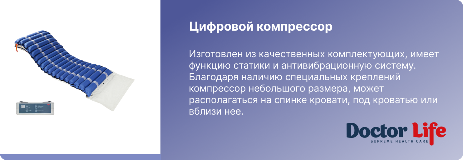 Секционный противопролежневый матрас с компрессором Doctor Life T01-P09 предназначен для людей, длительно находящихся в лежачем положении. Рекомендован для профилактики и лечения пролежней 1-2 степеней.