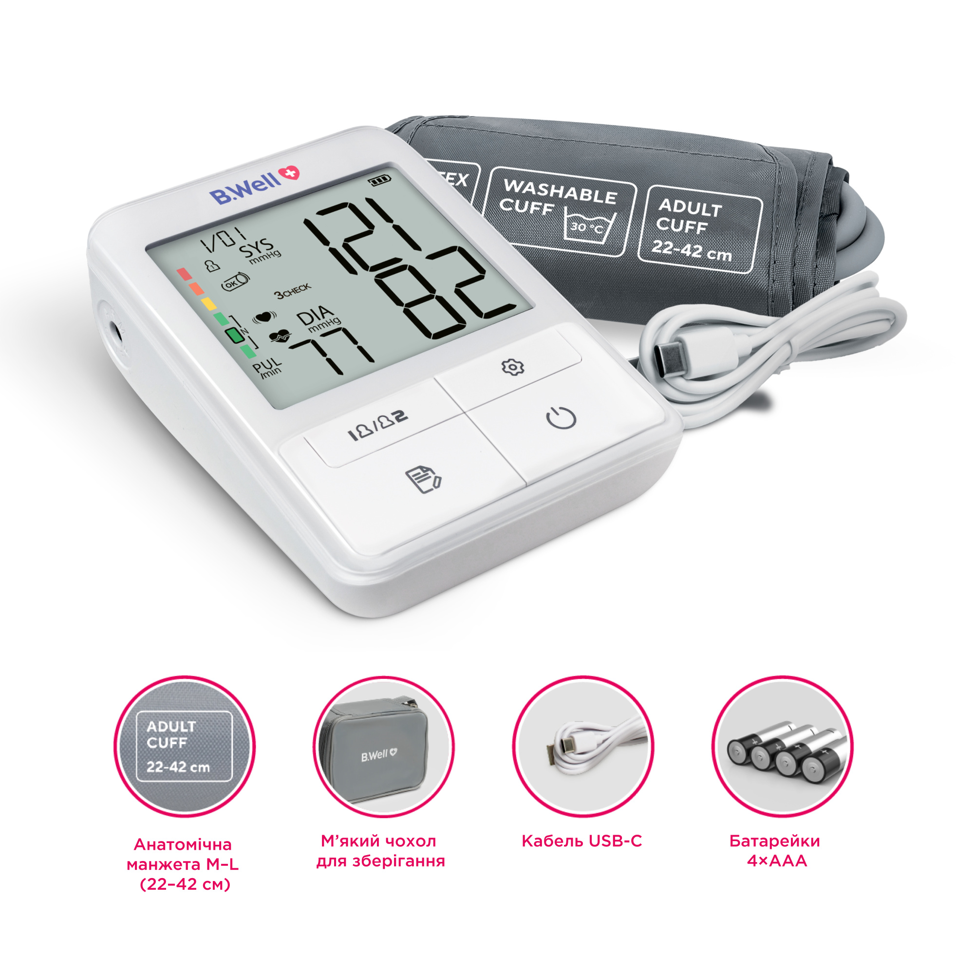 В комплект входит адаптер для питания от сети и USB-C, что делает его еще более удобным. Большой дисплей с четкими цифрами и индикатор аритмии помогают легко контролировать состояние здоровья.