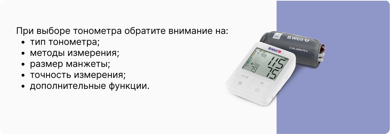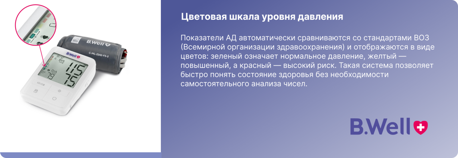 Измерение давления с B.Well будет комфортным: анатомическая форма позволяет избежать излишнего сжатия руки. Манжета подходит для окружности руки 22-42 см.